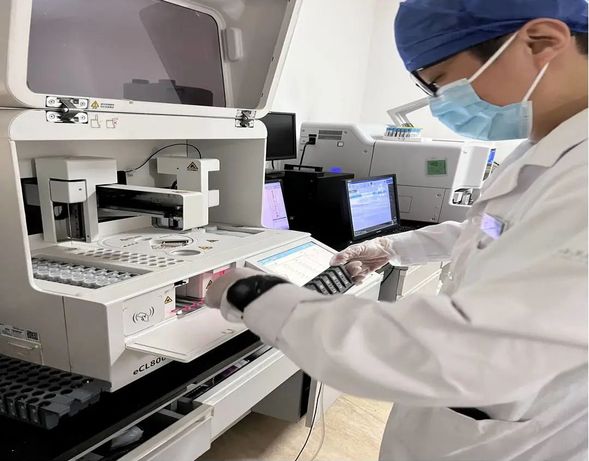 就诊患者大多数有心脏不适的症状,医生在做心肌酶检测。每天心肌酶检测仪器都是处于满载的状态在工作,医生也是全力以赴。