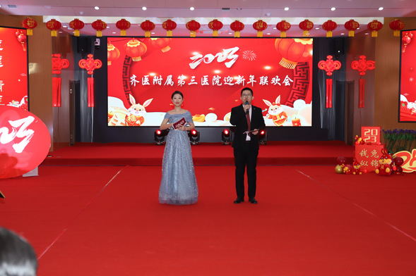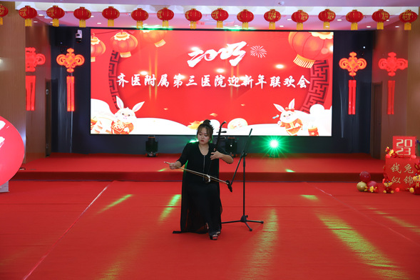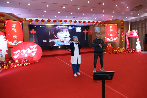 副院长杨钰为大家倾情演唱《外面的世界》,伴随着动人的歌声,每一个人都想起了那些平日的来来往往和忙忙碌碌,世界很精彩,也会有无奈,但附三人与死神赛跑的决心和救死扶伤的信念从未改变;欢乐欢乐中国年,同喜同喜中国年,女声独唱《欢乐中国年》,饱含深情的演绎,烘托了新年的祥和氛围,唱出了附三人的心声以及对医院的美好祝福;男声独唱《拯救》,大气磅礴的歌声向大家展示了医者勇气和担当;古典乐器二胡独奏《青花瓷》,悠扬似高山流水,人与曲的交融使观众仿佛置身仙境,诉说着中华传统乐器的无穷魅力;男女合唱《有一点动心》,不仅为大家带来了欢乐,也向大家展示了爱的魅力;女声独唱《陪我看日出》,婉转的歌声轻盈却有力量,让大家感受到了奋战在临床一线的医务人员日日夜夜的陪伴与坚守;小品《逆向而行》,基调欢快,内涵深刻,展现了新时代附三人勠力同心、义无反顾支援抗疫任务的担当与勇气;流年飞逝,女声二重唱《被风吹过的夏天》,让人忆起从前的青涩,铭记现在的勇敢,过去的艰辛历程成为了附三人难忘的光辉岁月,蓦然回首,时光如水已奔流而去;相声《三句半》形式新颖、诙谐幽默、包袱不断,收获了大家热烈的掌声;奋斗是青春最亮丽的底色,而始终不变的是医者的初心,男女合唱《小酒窝》甜蜜温暖,就像医护人员的暖心服务,使人如沐春风;携手同心,共抗疫情,由援齐市方舱抗疫医疗队队员带来的情景剧《方舱之歌》,再现了在过去三年的抗疫经历中,我院全体医护人员日日夜夜、寒来暑往的坚守,诉说了附三人只争朝夕的豪迈干劲、众志成城的强大合力和为人民健康保驾护航的坚毅决心。
