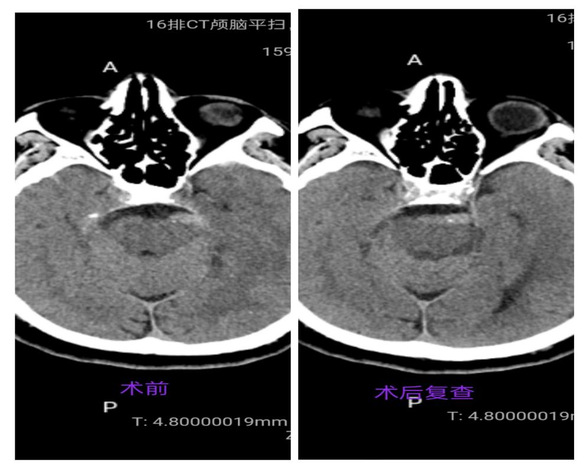 王云龙副主任医师根据患者的病情及身体状况为该患者制定了个体化的治疗方案,因患者年龄较高,经严格的药物治疗效果不佳,恐惧开颅手术对微血管减压术依从性较差,术前三叉神经MRI检查提示患者系较粗大的椎基底动脉移位压迫左侧三叉神经根,患者长期高血压脑动脉硬化,经颅行微血管减压将血管推离三叉神经根且悬吊难度大,老人家不愿意行选择性三叉神经感觉根切断术,综合以上因素为老人家制定经皮穿刺三叉神经半月结微球囊压迫术的手术方案。该术式属于神经外科介入手术,在C型臂或脑血管造影机或神经外科手术机器人的定位下进行,手术时间短,且具有微创、无血、恢复快的优点,面部仅仅一个针孔,术后无任何痕迹,且费用低。老人家欣然接受,手术如期进行,麻醉诱导完成后,手术用时15分钟,术后疗效立竿见影,疼痛完全消失,折磨患者5年的三叉神经痛终于获得成功治愈,老人家脸上终于露出了久违的笑容,患者于术后第二日即康复出院。