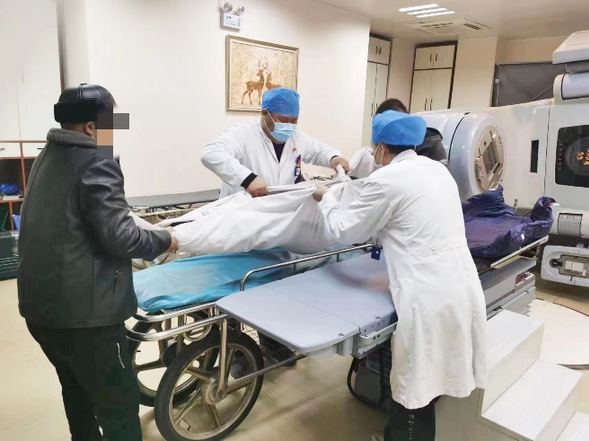 对于行动不便的患者,放疗中心的党员们主动承担起了“临时家属”的角色。35岁的张先生因脑转移来我院放疗,体重近300斤,身体无意识,每次需推平车进出放疗中心。放疗技师负责把患者推入放疗中心治疗室,抬放患者上下治疗床,待治疗完成再将患者安全送回,大大减少了患者在院等待时间。“谢谢你们,有你们在,我们心里特别踏实。”这一举动,收到了患者家属的连声感谢。