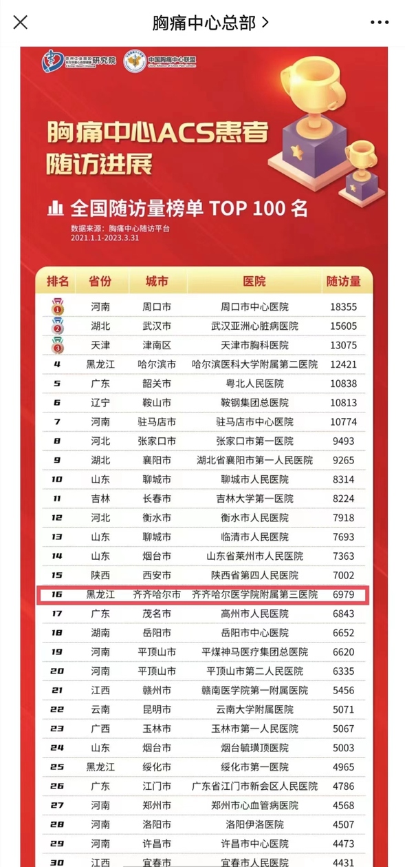 在胸痛中心总部于4月11日发布的2023年胸痛中心随访突出贡献榜单中,我院荣获第16位的好成绩。自我院胸痛中心积极开展ACS患者随访工作以来,通过建立随访体系、规范二级预防、建立院前急救、院中救治、院外随访康复的全流程管理模式等方式,增加了患者定期随访率,提高了诊疗依从性,及时发现危险因素及评估心脏功能,降低了MACE再发风险、改善了患者长期预后。截至2023年3月21日,我院随访病例已达6979例,位于全国随访量第16位。今后,我院会进一步推进随访工作,不断总结分析,使ACS患者管理更加完善,不断改善患者预后,从而降低我国ACS患者心血管不良事件的再发率和死亡率,助力健康中国建设。