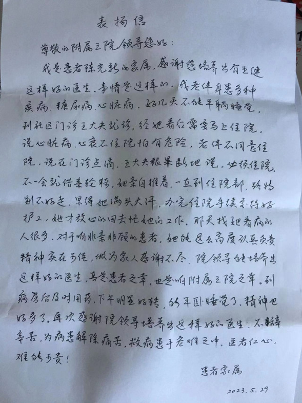 患者家属为表达真切的诚意,又亲笔写下一封感谢信。信的篇幅虽不长,语言也很质朴,但它却见证了医患之间真诚、温暖的情谊。一笔一划间,诉说着患者病情好转的喜悦,饱含着对王健医生的感恩和敬意,寥寥数语,让大家感受到医患之间的真诚与和谐。