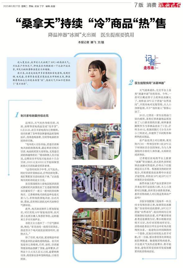 近两日,天气炎热导致空调、风扇、冰箱等家电商品变成“抢手货”。6月25日,在华丰家电商内记者看到, 店内贴满了各种降温解暑商品的促销标识,前来选购冰箱、空调等电器的市民络绎不绝。