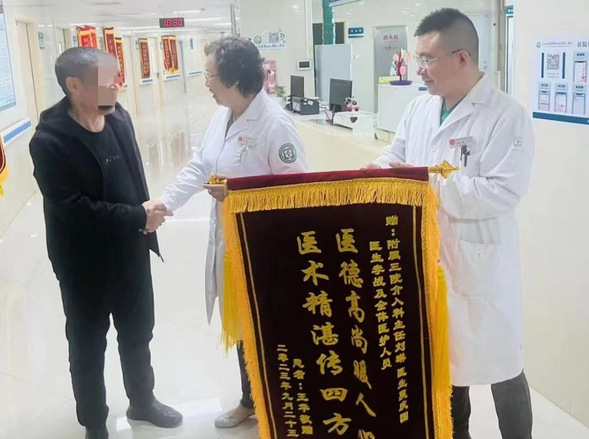 在齐医附属三院介入科病房,记者见到了这位晚期肝癌患者王先生,并将一面印有“医德高尚暖人心,医术精湛传四方”的锦旗,亲手送到介入科刘琳主任手中以表感激之情,刘琳主任在询问王先生身体状况时,此时他的脸上洋溢着幸福的喜悦,整个人“焕然一新”。