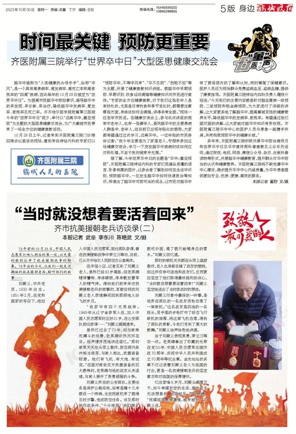 多年来,齐医附属三院积极开展卒中防治宣传月和世界卒中日及卒中宣传周科普宣教及义诊系列活动,通过电视、网络、微信公众号、报纸、杂志、出版科普读物等形式,开展脑卒中健康教育,提升群众对卒中防治的认识和健康素养。齐医附属三院将不断完善卒中中心建设,稳步提升卒中中心内涵质量,为卒中患者提供更加专业、优质、便捷、高效的服务。