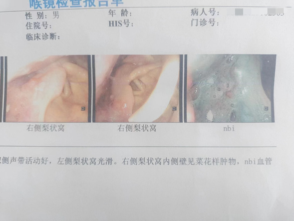 患者男性,74岁,因右侧下咽部疼痛,伴吞咽痛一个月左右后到我院就诊。门诊行NBI电子喉镜检查,发现右侧梨状窝菜花样肿物,经NBI窄带成像技术,发现肿物表面血管不规则,增粗、紊乱、迂曲,考虑恶性,经电子喉镜下病理取材回报:低分化鳞状细胞癌。肿瘤范围较广泛,累计右侧梨状窝内侧壁、前壁、外侧壁的一部分。
