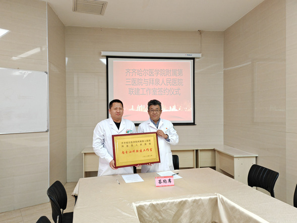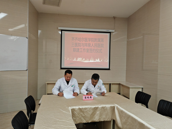 近日,我院副院长辜振刚与拜泉县人民医院副院长张博在我院影像示教室签订了内分泌科联建工作室协议。拜泉县人民医院医务科科长张大鹏及我院内分泌二科主任金立、放射影像诊断中心主任温丽娟和医疗合作办公室主任周扬参加签约座谈会。