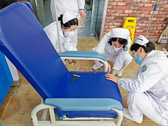 社区服务中心内静点椅由于年头较长,利用率较高,有些椅子已经破旧,于是,护士长在网上购买了包椅子的材料,社区护士在护士长的带领下“自己动手,丰衣足食”,将10把静点椅重新包装后椅子焕然一新,患者看了不禁夸奖社区服务中心里都是全能护士。