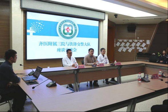 铁锋交警大队副大队长张浩讲话。他表示,人民警察与医生共同承担着保障人民生命安全和身体健康的重任,希望今后能通过建立警医合作长效沟通机制,在患者救治、道路安全和急救常识科普宣教等方面不断深化合作,保证事故伤者处理的及时性和科学性。