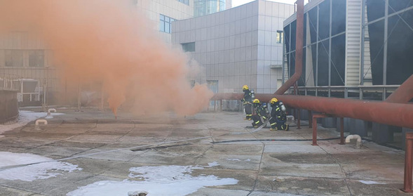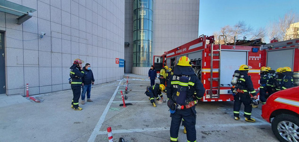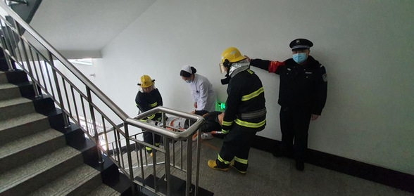 演练过程中,我院保卫科组织安保人员与消防员共同协作。模拟演练信号发出后,我院义务消防员和安保人员负责快速沿楼梯铺设水带,开展室内人员疏散、逃生、救援等流程;消防队专业消防人员前往设备层屋面铺设水带灭火并操作消防车对我院设备层模拟起火位置进行现场扑救,演练过程配合流畅,行动迅速。