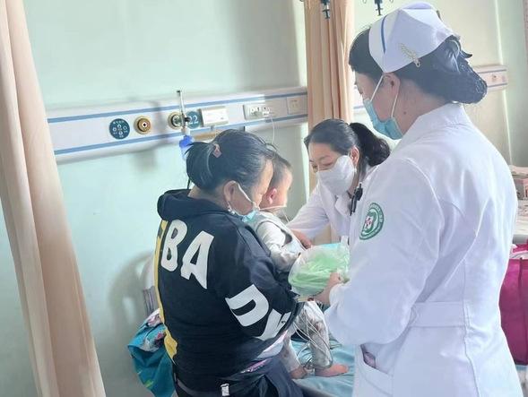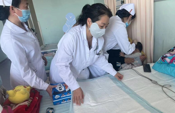 由于孩子较小,经常会将床铺尿湿,儿科副主任亢杨为孩子买了一包护理垫,并帮助孩子妈妈铺好床铺,同时协助孩子妈妈给孩子更换干净的衣物。孩子妈妈虽然不善言辞,却也感谢连连。