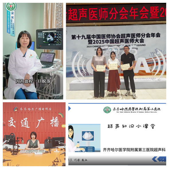 (图1:梁笑录制的科普视频截图;图2:超声科3名医生荣获多个奖项;图3:梁笑做客《鹤城大医生》栏目;图4:超声科制作科普视频截图。)