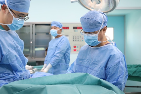 我院血管外科孟庆宇医生(右)为患者行颈动脉内膜剥脱术