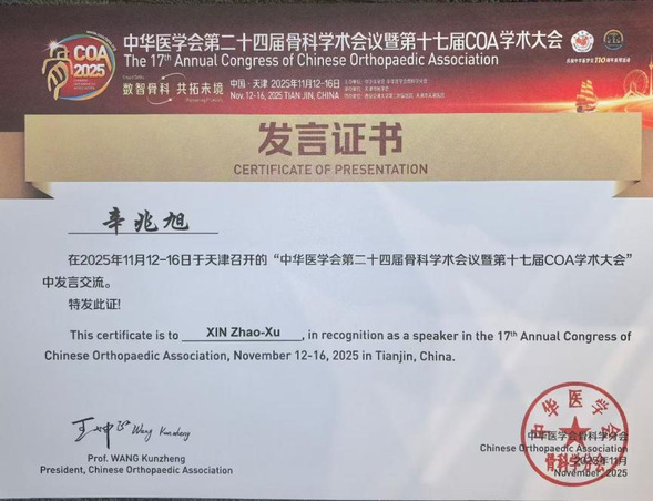 此次大会的成功举办,不仅推动了骨科医学的发展,还为广大骨科医生提供了一个宝贵的学习交流平台。我院骨外一科负责人辛兆旭在这一国内顶级骨科学术殿堂的发声,是我院骨科临床技术与科研能力持续提升的体现。今后,我院将继续支持临床科室积极参与高水平的学术交流,不断引领学科前沿,将最新的技术和理念应用于临床,以更优质的医疗服务造福广大患者。