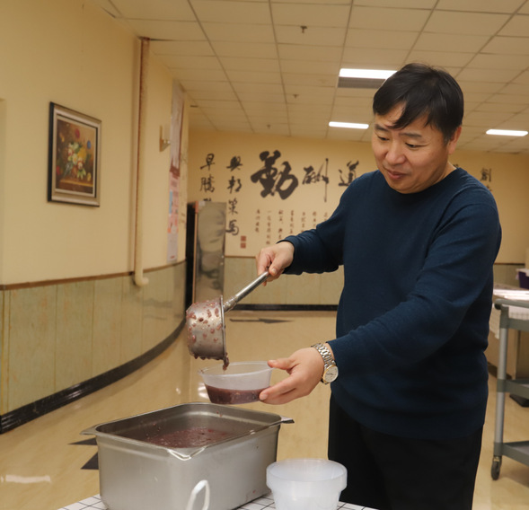 党员同志们早早地来到食堂,大家分工协作、有条不紊:淘洗食材、分装腊八蒜和腊八粥……一碗碗热气腾腾的腊八粥,承载着医院对一线人员的牵挂,连同党员同志们的心意一同被装进餐盒,由各党支部送至内科科室值班人员手中。