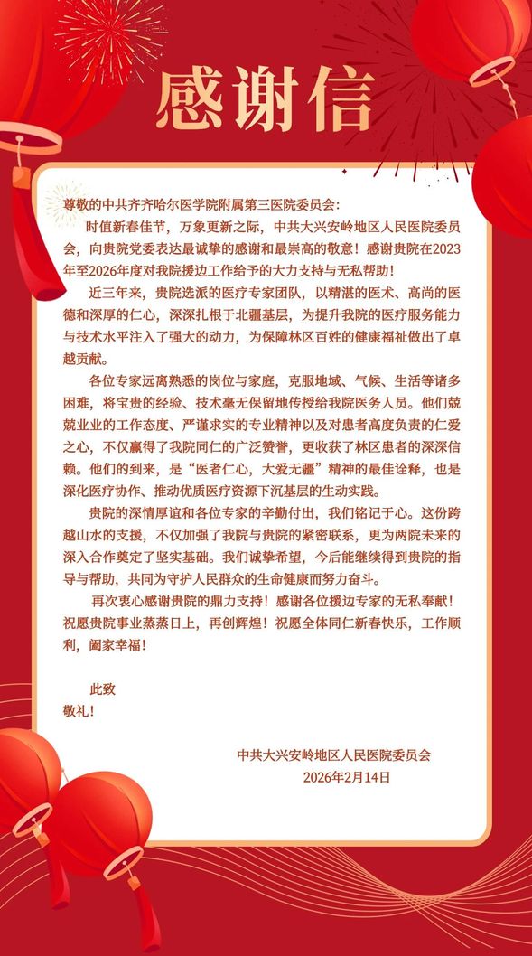 2月14日,在新春佳节即将到来之际,我院收到了一封来自中共大兴安岭地区人民医院委员会的感谢信。信纸虽薄,情谊千钧,字里行间流淌着大兴安岭地区人民医院对我院过去三年援边工作的深深认可,更跃动着两院携手同行的赤诚脉搏。