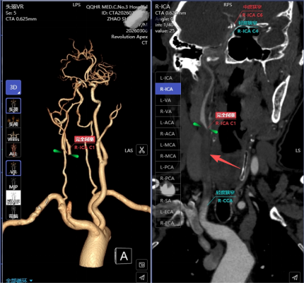 头颈部CTA检查:图像清晰地显示,赵先生的右侧大脑中动脉闭塞——这是导致病情的直接原因。