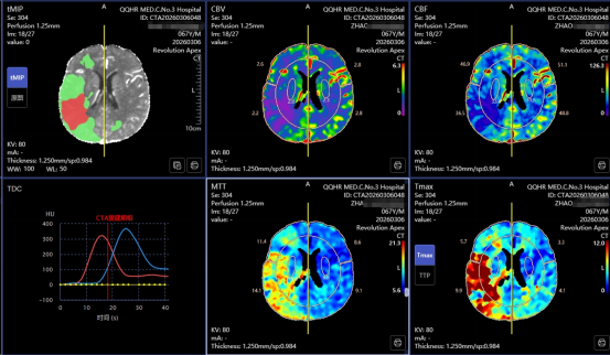 颅脑灌注分析(CTP)检查:通过先进后处理软件,系统快速生成全脑灌注图谱,精准量化核心梗死区与缺血半暗带的大小。结果显示,患者右侧大脑半球虽已出现大面积脑梗死,但仍存在可挽救的缺血半暗带。