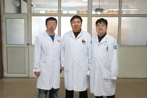 副院长杨钰与肿瘤内三科主任郑广(左)、副主任高守宝(右)合影