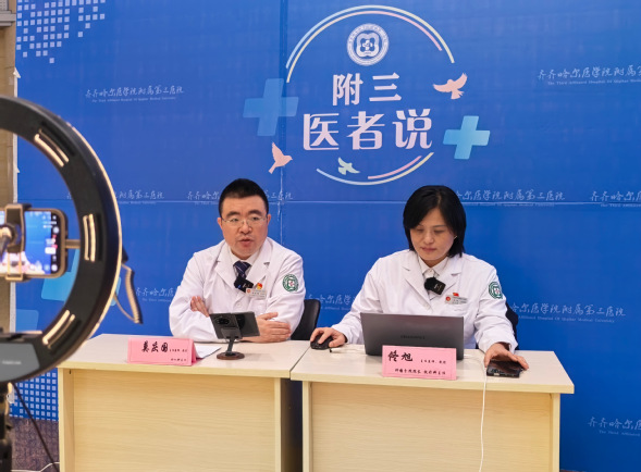 为了让未能亲临现场的患者同样享受到优质医疗服务,医院同步开启线上线下联动模式。针对肿瘤早期信号识别、放疗与介入治疗在肿瘤综合治疗中的核心作用等群众普遍关心的热点问题,我院放疗科主任佟旭与介入放射科主任莫庆国通过医院官方视频号“附三医者说”健康直播间进行细致解答。线上观众踊跃提问,专家实时回应,实现了医疗资源的有效延伸和覆盖,全方位满足了市民的健康需求。