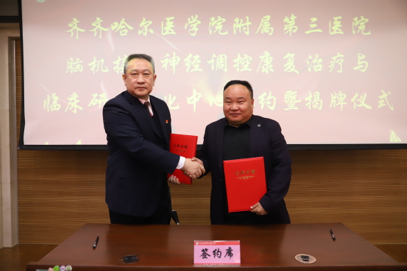4月24日9:30,我院在住院综合楼三楼第一会议室举行“脑机接口神经调控康复治疗与临床研究转化中心”签约暨揭牌仪式。这标志着黑龙江省西部地区首家集 非侵入式脑机接口、神经调控、智能康复于一体的标准化康复平台正式落地,填补了区域高端神经康复技术的空白,也意味着鹤城百姓在家门口即可享受到国内前沿的“意念控制康复训练”智能医疗服务。学院党委副书记张可勇,市卫健委副主任李峰,市卫健委医政科科长宿健,翔宇医疗营销中心总监梁永强及其团队,我院领导班子成员出席会议,神经内科、神经外科、康复专业等科室相关人员参加仪式。仪式由副院长刘忠锦主持。
